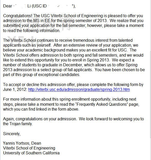 恭喜!来自浙江的李同学被被University of Southern California-南加州大学2013入学的硕士研究生MSEE电子工程课程录取,再次恭喜!