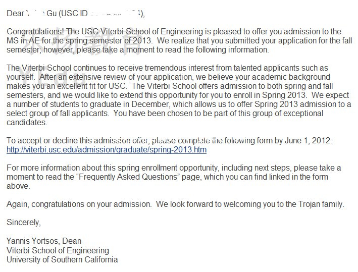 南京的顾同学被University of Southern California 南加州 @恭喜顾同学录取!