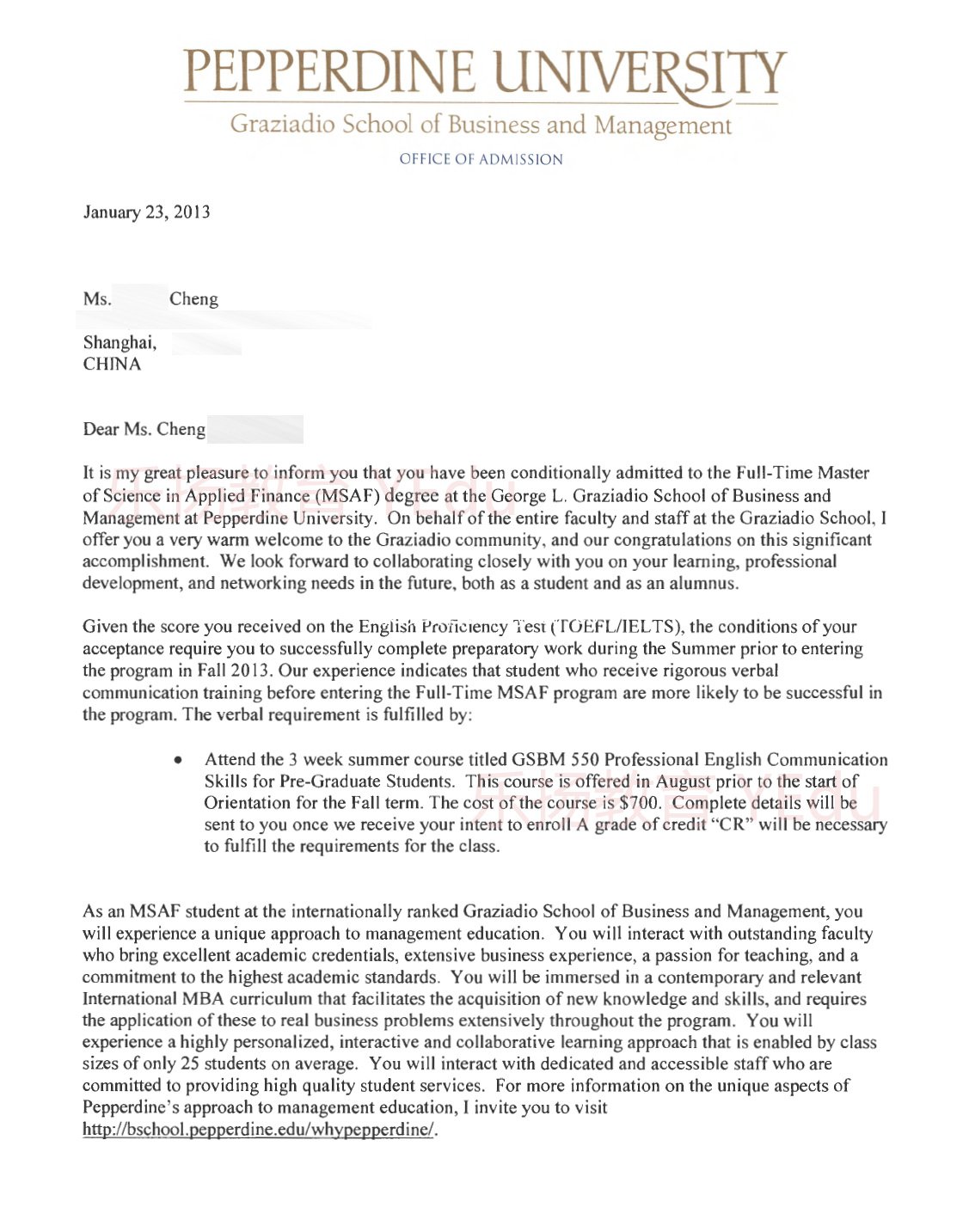 恭喜!来自上海的Cheng同学被Pepperdine University-佩波戴恩大学2013入学的硕士研究生MSAF应用金融课程录取,再次恭喜!