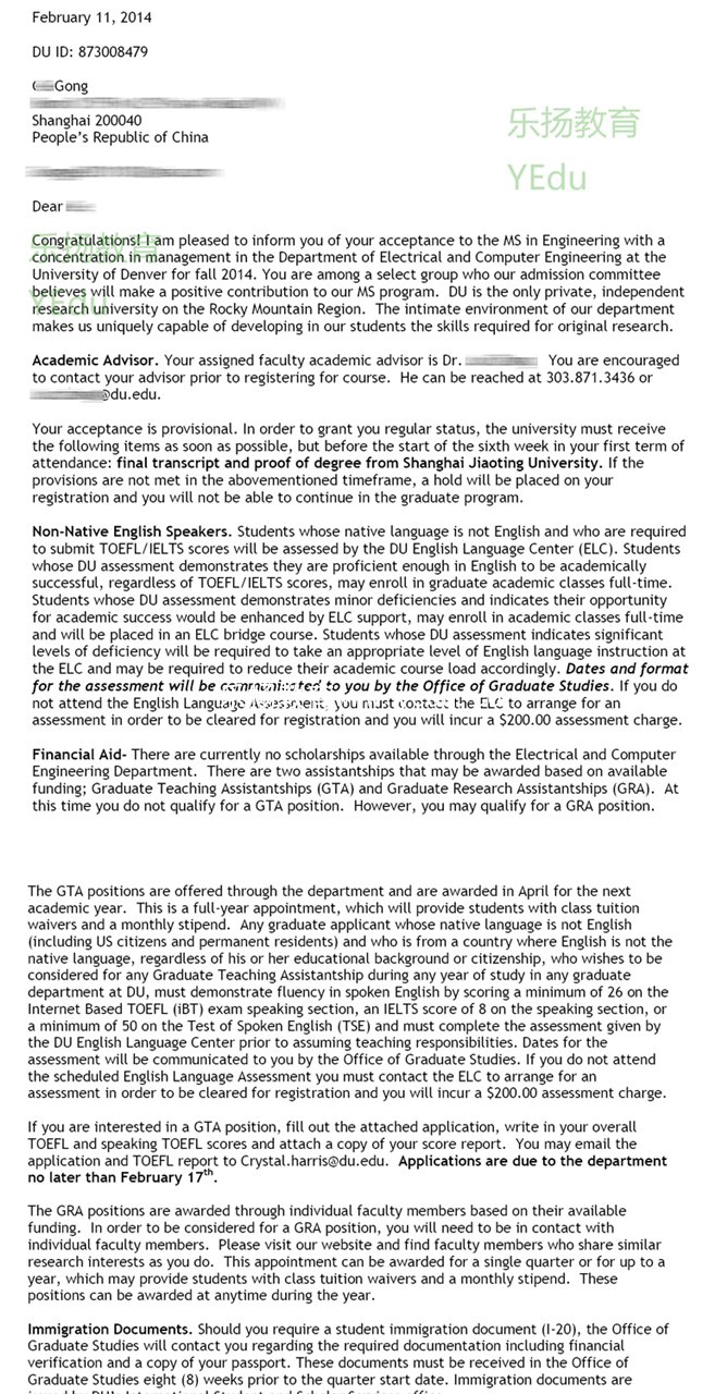 恭喜!来自上海的Gong同学被University of Denver-丹佛大学2014入学的硕士研究生MS Engineering Management工程管理硕士课程录取,再次恭喜!