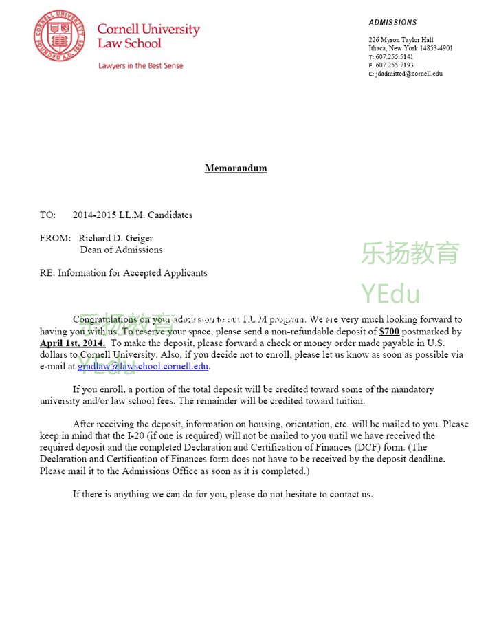 恭喜!来自上海的吴同学被Cornel University-康奈尔大学2014入学的硕士研究生LLM法学硕士课程录取,再次恭喜!
