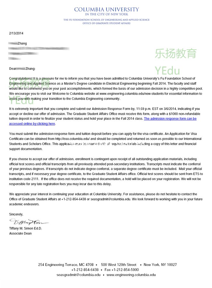 恭喜!来自上海的Zhang同学被Columbia University-哥伦比亚大学2014入学的硕士研究生MS Electrical Engneering 电子工程硕士课程录取,再次恭喜!