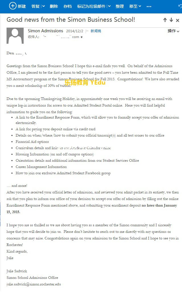 恭喜!来自上海的Ren同学被University of Rochester-罗彻斯特大学2015入学的本科新生MS Accountancy 会计硕士课程录取 ,并获得奖学金:学费30%减免 ,再次恭喜!