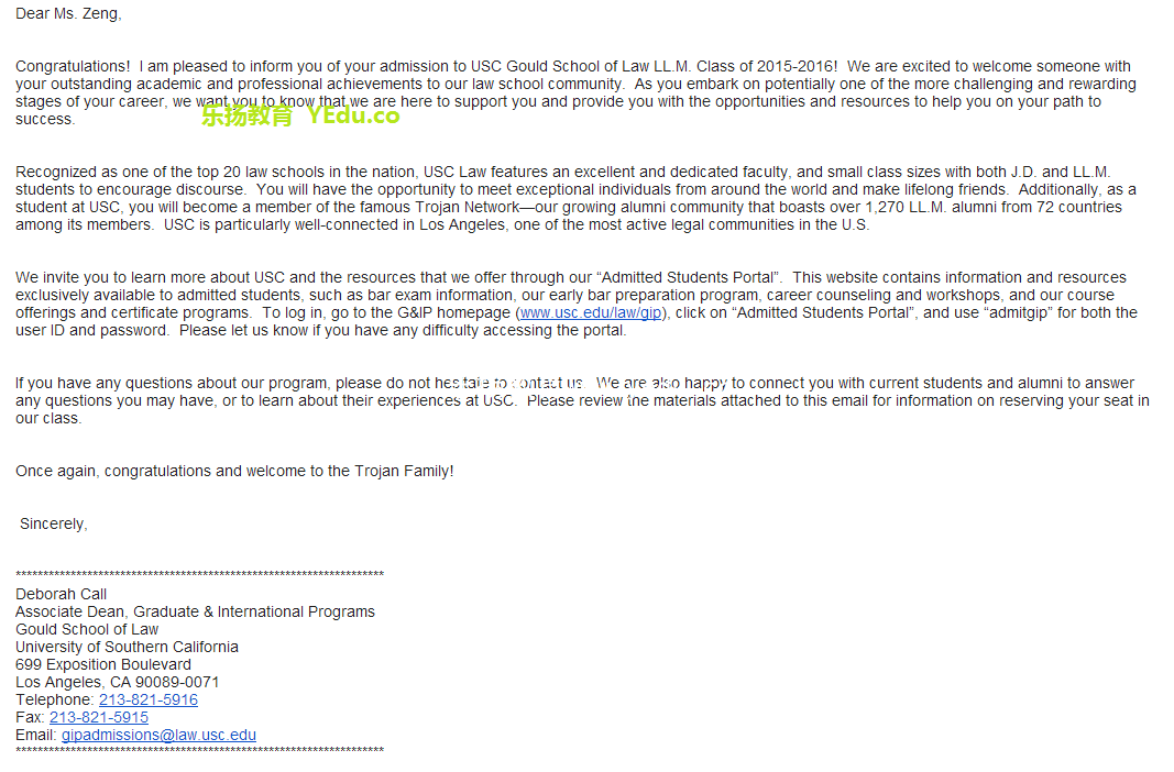 恭喜!来自上海的曾同学被University of Southern California-南加州大学2015入学的硕士研究生LLM法律硕士课程录取,再次恭喜!