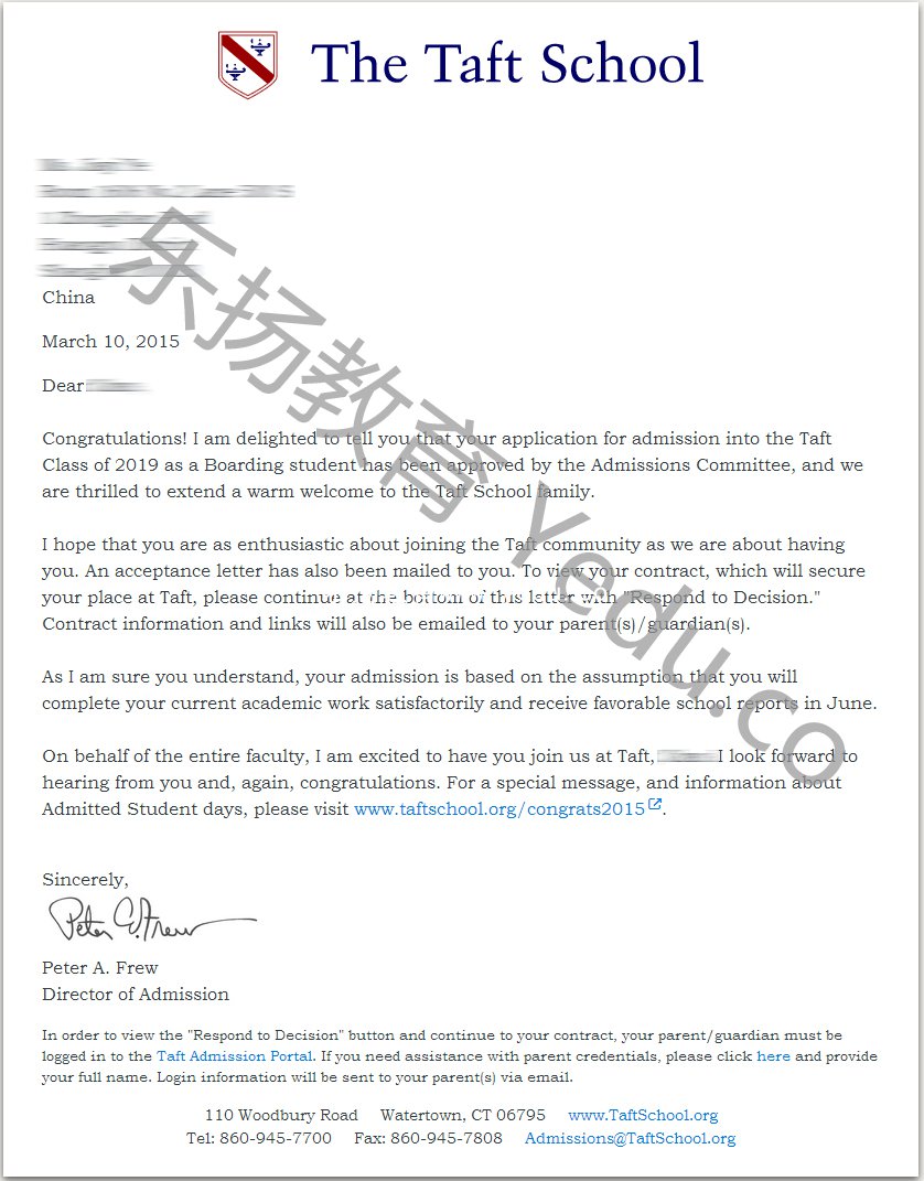 恭喜!来自上海的Y同学被Taft School-塔夫特中学(顶尖前10寄宿中学)2015入学的9年级取9年级新生课程录取,再次恭喜!