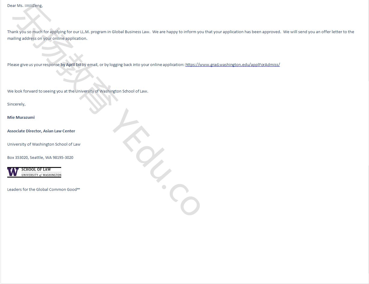 恭喜!来自上海的Zeng同学被University of Washington--Seattle-华盛顿大学2015入学的硕士研究生LLM法学硕士课程录取,再次恭喜!