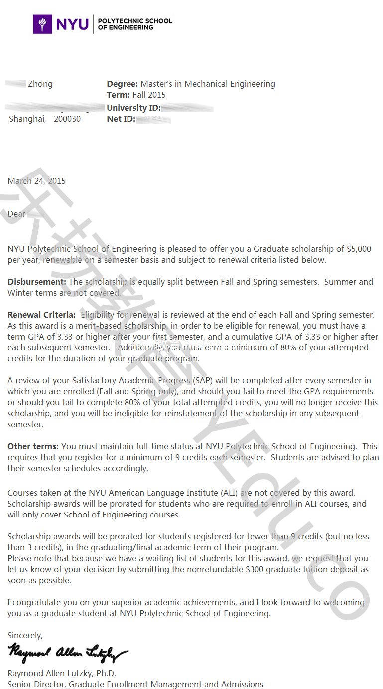恭喜!来自上海的Zhong同学被New York University-纽约大学2015入学的硕士研究生MS Mechanical Engineering机械工程课程录取 ,并获得奖学金:每年5,000美金 ,再次恭喜!