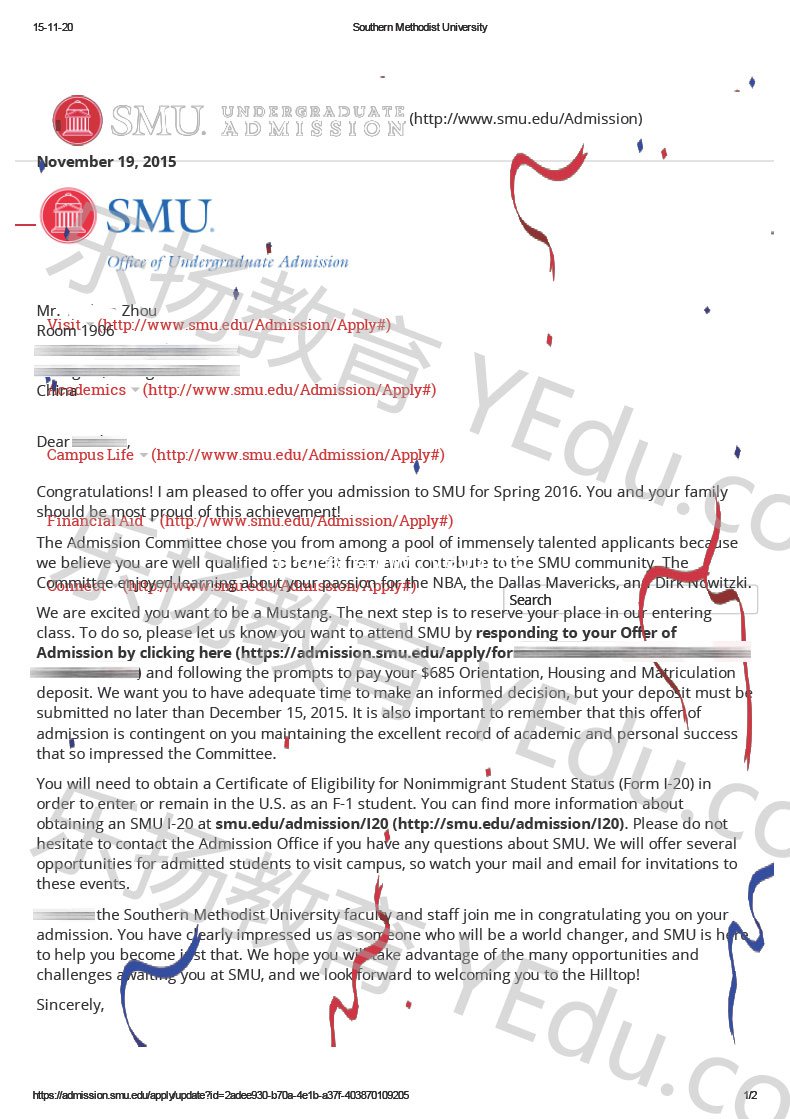 恭喜!来自上海的Zhou同学被Southern Methodist University-南卫理公大学2016入学的本科新生通科课程录取,再次恭喜!