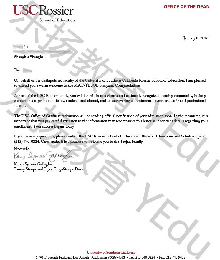 恭喜!来自上海的Yu同学被University of Southern California-南加州大学2016入学的硕士研究生MAT-TESOL课程录取,再次恭喜!